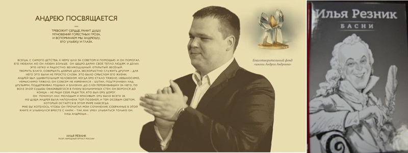 Творчество Ильи Резника – не только хиты, любимые народом. Многие знают его как прекрасного, тонкого и умного человека с большой открытой душой. Узнав о горе, постигшем семью Андреевых, Илья Рахми́элевич не смог остаться безучастным. Он посвятил свою новую книгу басен памяти Андрея Андреева. Мы благодарим Илью Рахми́элевича за это душевный щедрый дар.
